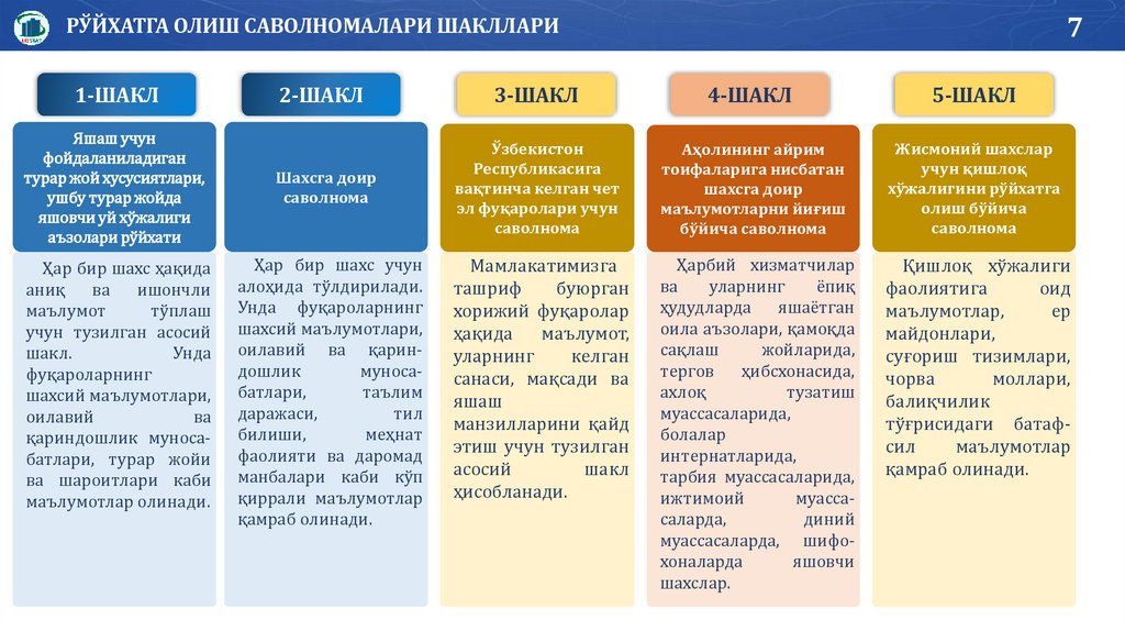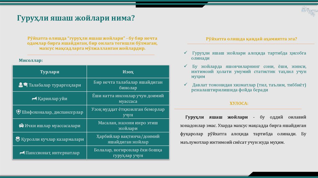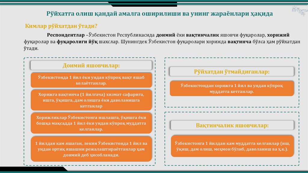 Доимий яшаш жойи ва уй хўжалигиУй хўжалиги таркибига кириб рўйхатдан ўтадиганлар