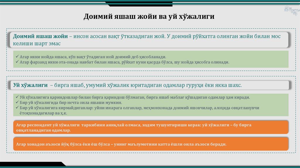 Агар респондент уй хўжалиги таркибини аниқлай олмаса, ходим тушунтириши керак: уй хўжалиги – бу бирга