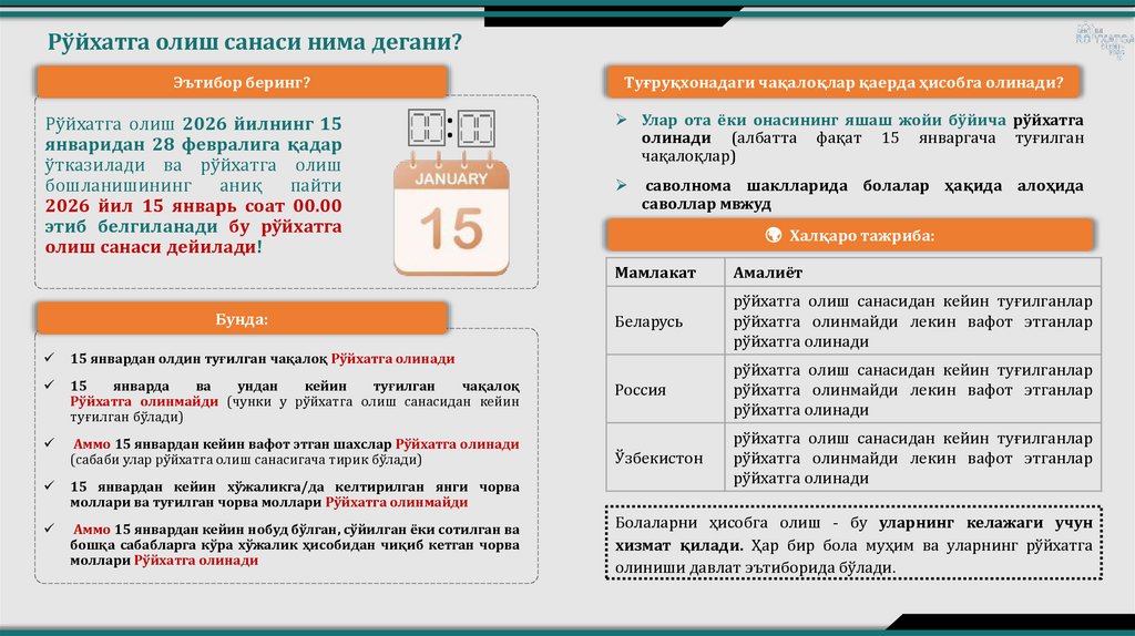 15 январдан олдин туғилган чақалоқ Рўйхатга олинади