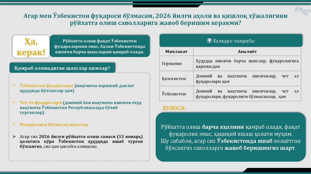 фуқаролар ва фуқаролиги йўқ шахслар. Шунингдек Ўзбекистон фуқаролари хорижда вақтинча бўлса ҳам рўйхатдан