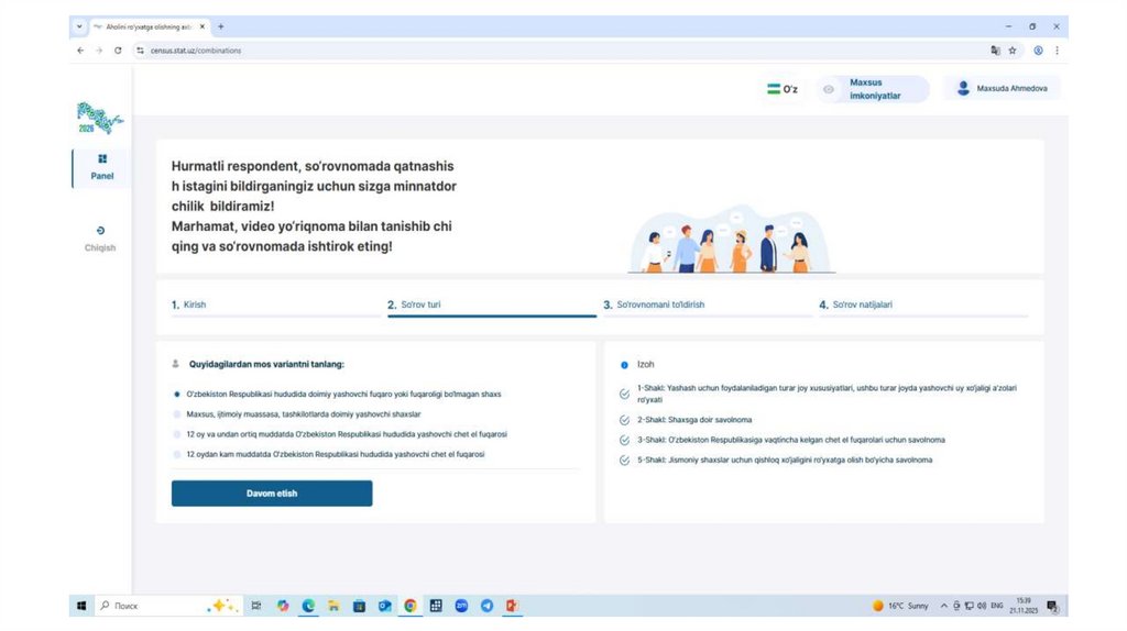 Респондентлар –Ўзбекистон Республикасида доимий ёки вақтинчалик яшовчи фуқаролар, хорижий