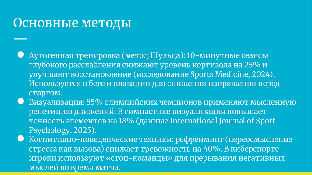 Основные методы: аутогенная тренировка, визуализация, когнитивно-поведенческие