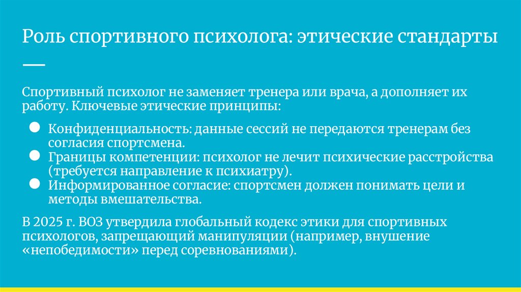 Роль спортивного психолога: этические стандартыСпортивный психолог не заменяет тренера или врача, а дополняет их