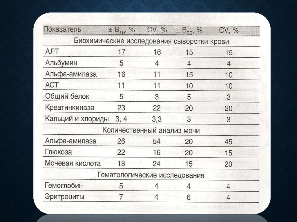 CV В % ДЛЯ НЕКОТОРЫХ ТЕСТОВ.Перечень биохимических исследований