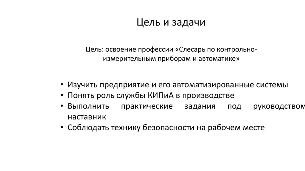 Цель и задачиЦель: освоение профессии «Слесарь по контрольноизмерительным приборам и автоматике»