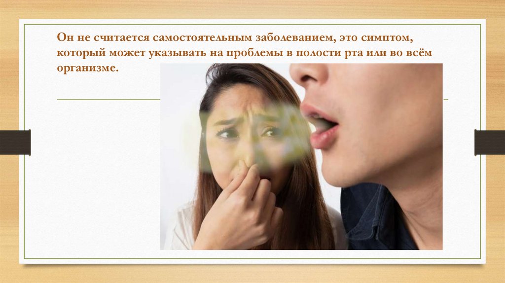 Он не считается самостоятельным заболеванием, это симптом,который может указывать на проблемы в полости рта или во всём