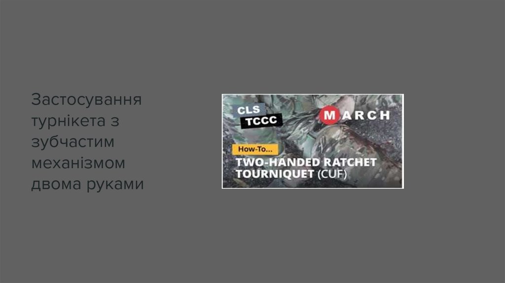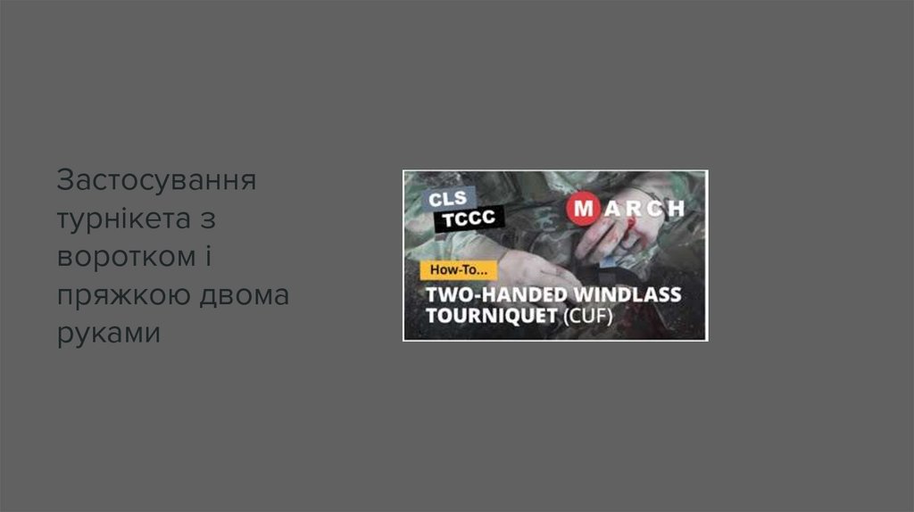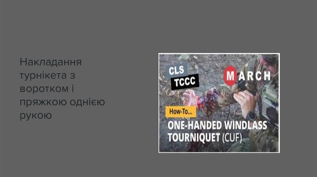 накладання турнікета на кінцівку для зупинки кровотечі, що загрожує життю,