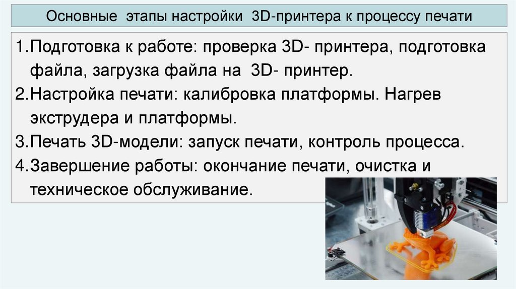 Основные этапы настройки 3D-принтера к процессу печати1.Подготовка к работе: проверка 3D- принтера, подготовка
