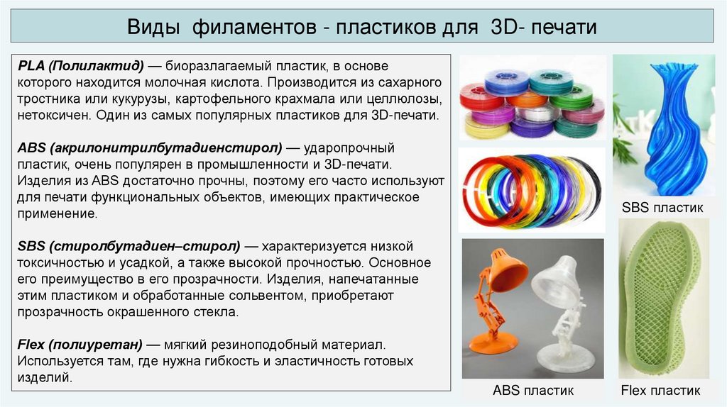 Виды филаментов - пластиков для 3D- печатиPLA (Полилактид) — биоразлагаемый пластик, в основе