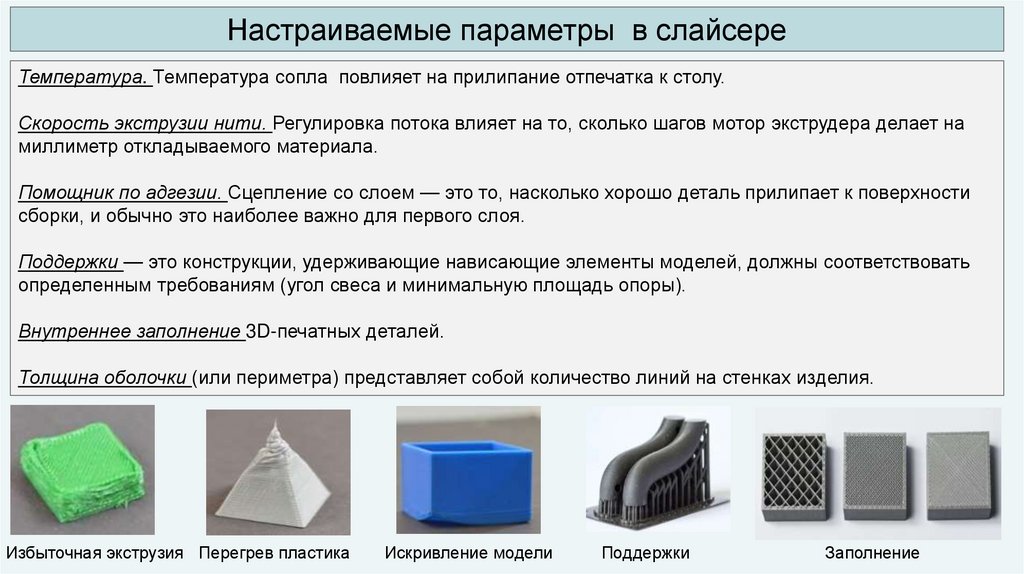 Настраиваемые параметры в слайсереТемпература. Температура сопла повлияет на прилипание отпечатка к столу.