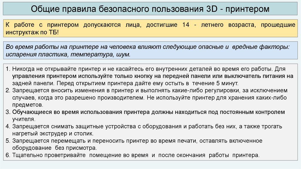Общие правила безопасного пользования 3D - принтеромК работе с принтером допускаются лица, достигшие 14 - летнего возраста, прошедшие