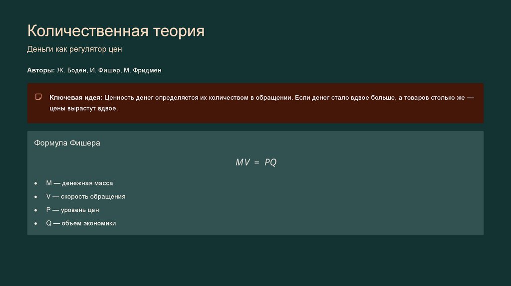Ключевая идея: Ценность денег определяется их количеством в обращении. Если денег стало вдвое больше, а товаров столько же —