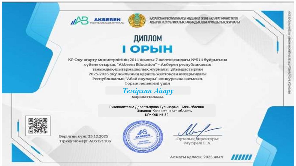 Руководитель: Давлетьярова Гульмаржан Алпысбаевна