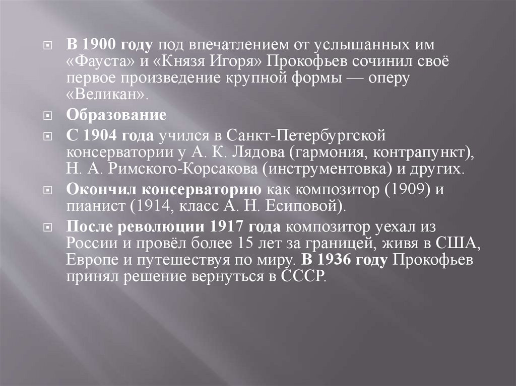 В 1900 году под впечатлением от услышанных им«Фауста» и «Князя Игоря» Прокофьев сочинил своё