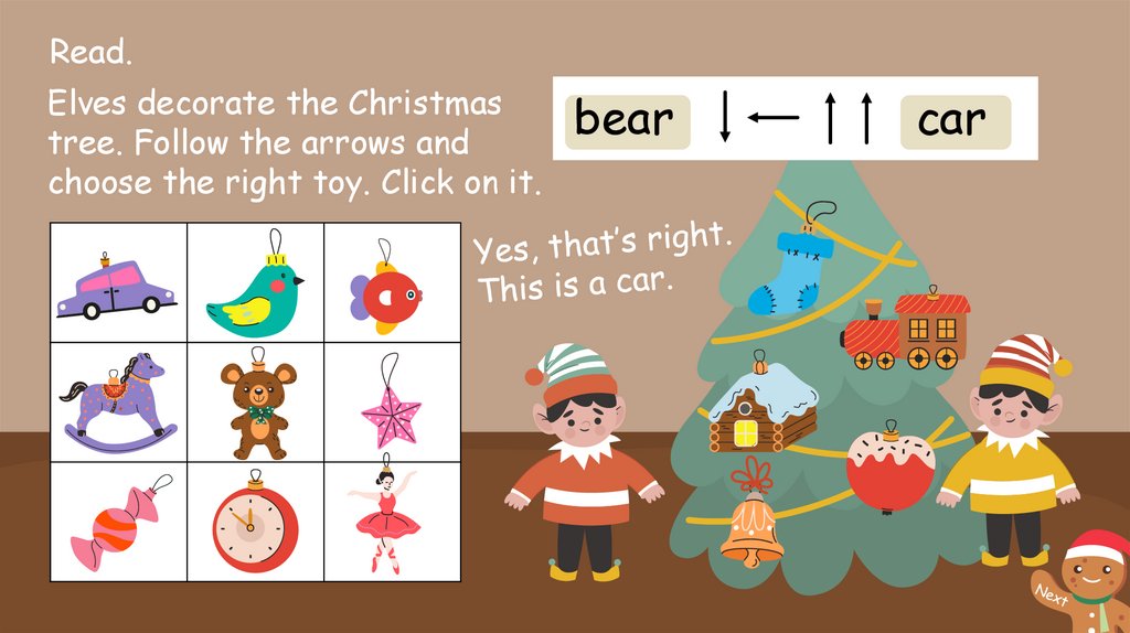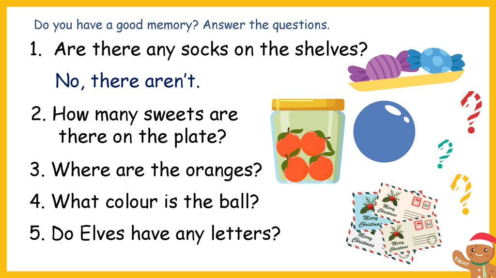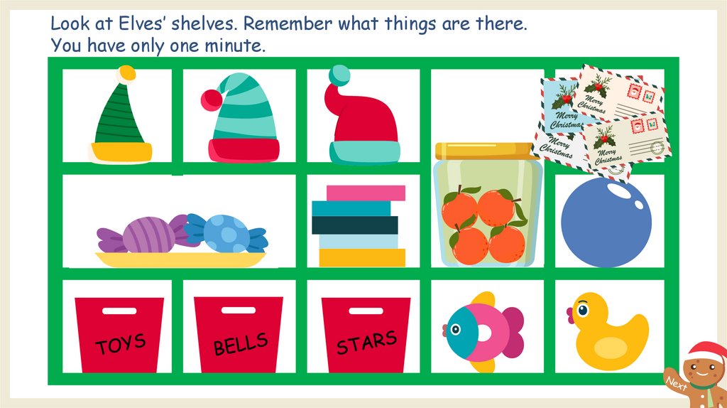Look at Elves’ shelves. Remember what things are there.You have only one minute.