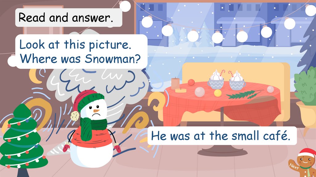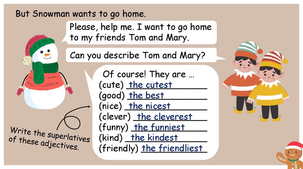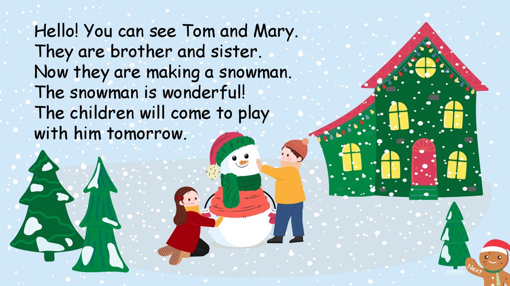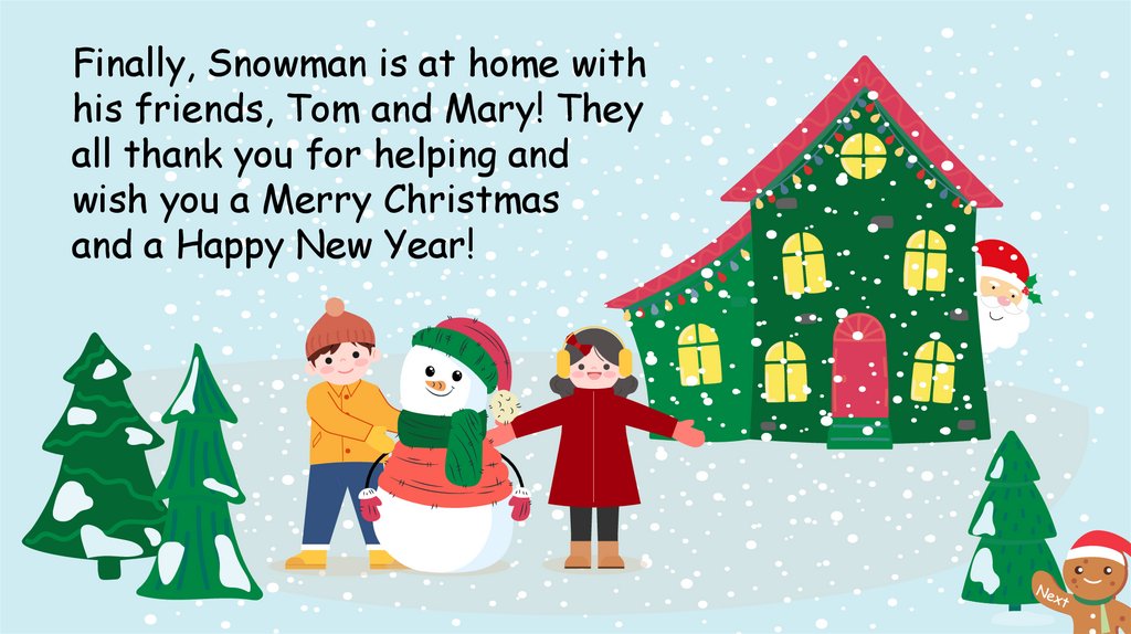 Finally, Snowman is at home withhis friends, Tom and Mary! They