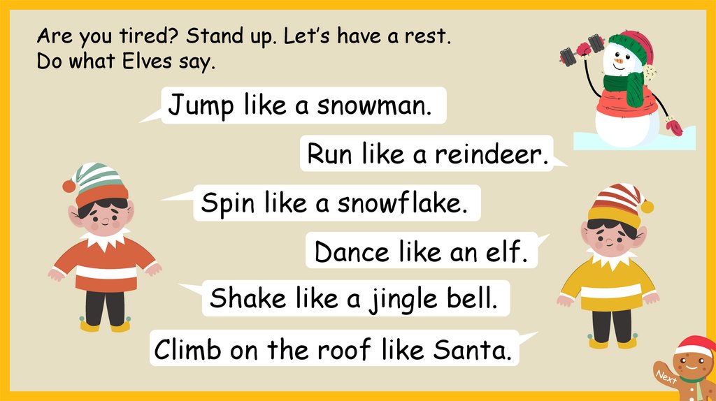 олень, кружатся как снежинка, танцуют как эльф, покачиваются как