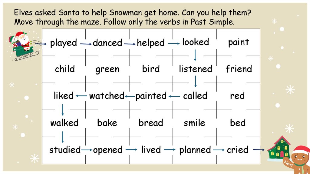 Elves asked Santa to help Snowman get home. Can you help them?Move through the maze. Follow only the verbs in Past Simple.