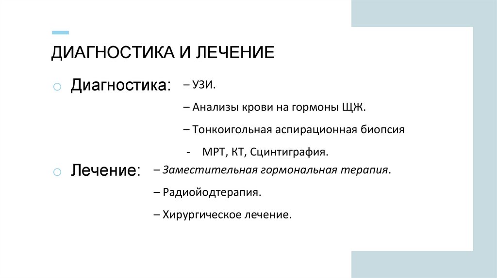 ДИАГНОСТИКА И ЛЕЧЕНИЕo Диагностика: