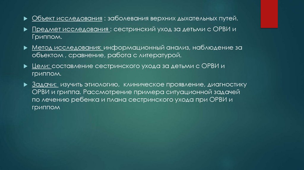 Объект исследования : заболевания верхних дыхательных путей.Предмет исследования : сестринский уход за детьми с ОРВИ и