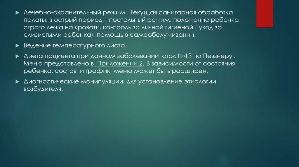 Лечебно-охранительный режим . Текущая санитарная обработкапалаты, в острый период – постельный режим, положение ребенка