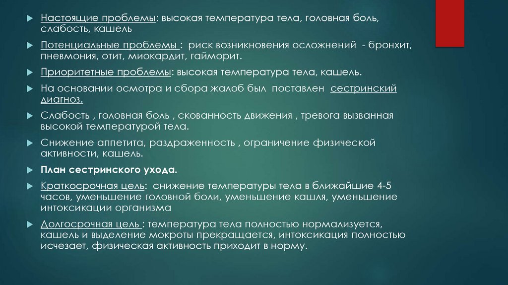 Потенциальные проблемы : риск возникновения осложнений - бронхит,