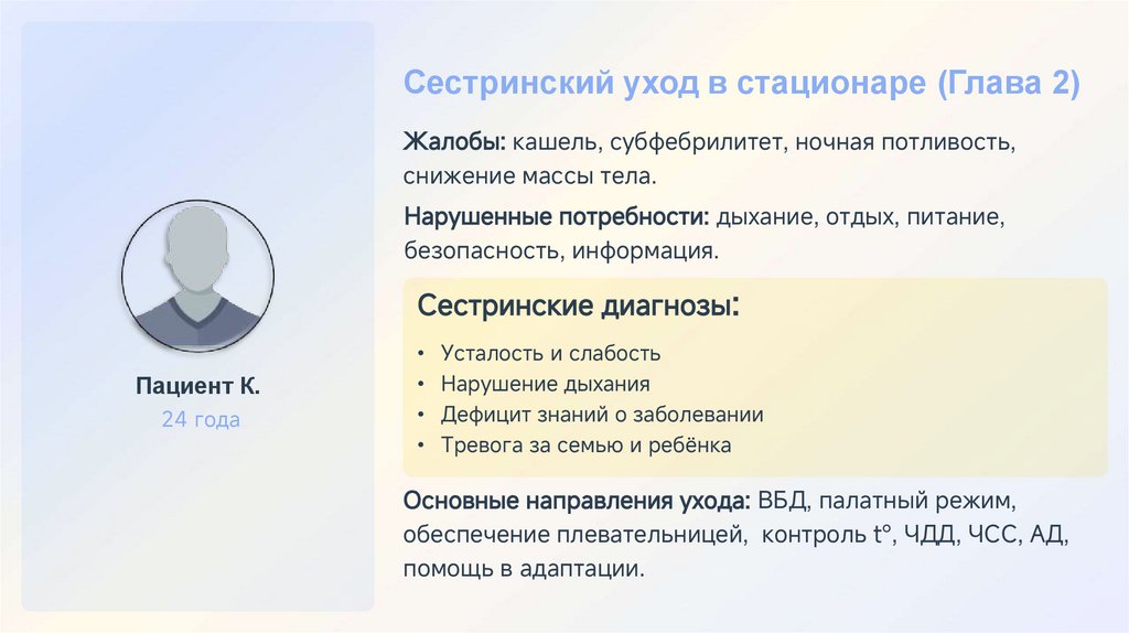 Сестринский уход в стационаре (Глава 2)Жалобы: кашель, субфебрилитет, ночная потливость,