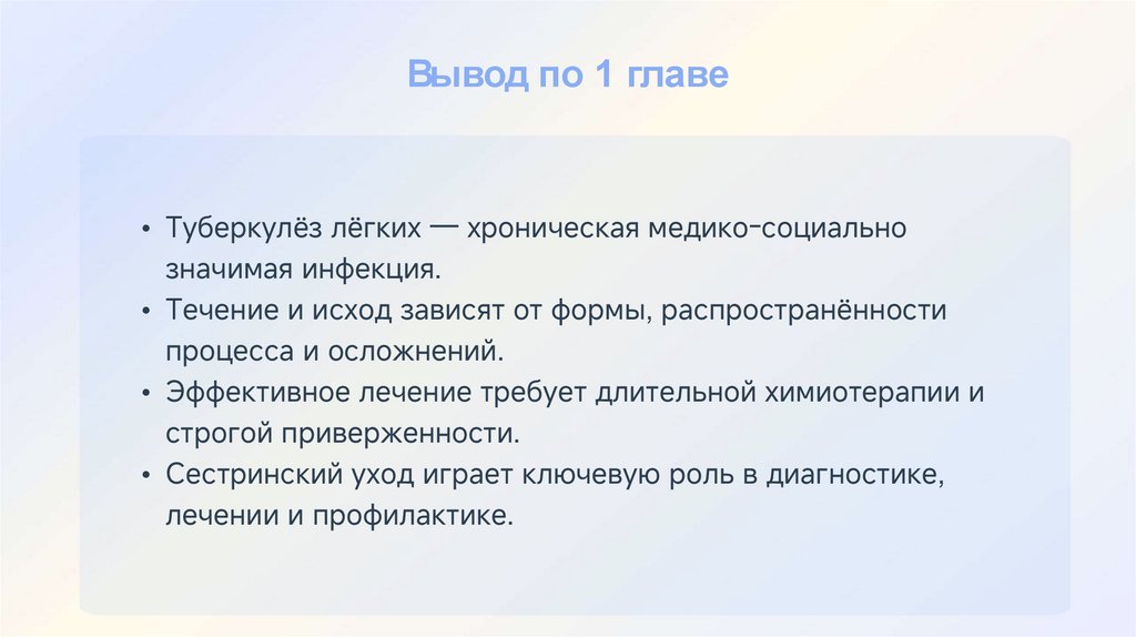 Вывод по 1 главе• Туберкулёз лёгких — хроническая медико-социально