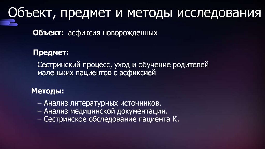 Объект, предмет и методы исследованияОбъект: асфиксия новорожденных