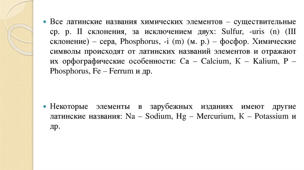 Все латинские названия химических элементов – существительныеср. р. II склонения, за исключением двух: Sulfur, -uris (n) (III