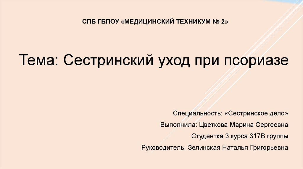 СПБ ГБПОУ «МЕДИЦИНСКИЙ ТЕХНИКУМ № 2»Тема: Сестринский уход при псориазе