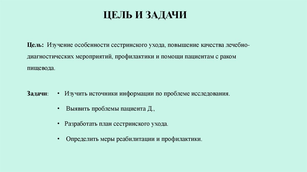ЦЕЛЬ И ЗАДАЧИЦель: Изучение особенности сестринского ухода, повышение качества лечебнодиагностических мероприятий, профилактики и помощи пациентам с раком