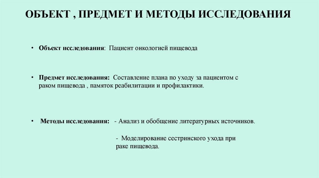 ОБЪЕКТ , ПРЕДМЕТ И МЕТОДЫ ИССЛЕДОВАНИЯ• Объект исследования: Пациент онкологией пищевода