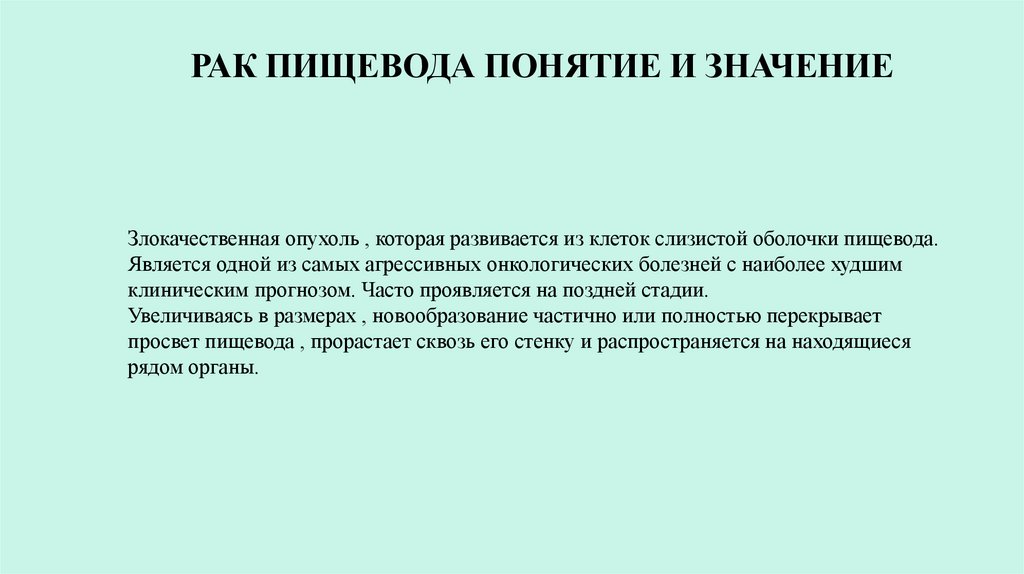 РАК ПИЩЕВОДА ПОНЯТИЕ И ЗНАЧЕНИЕЗлокачественная опухоль , которая развивается из клеток слизистой оболочки пищевода.