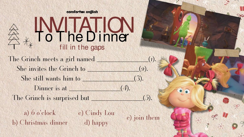 She invites the Grinch to _______________(2).