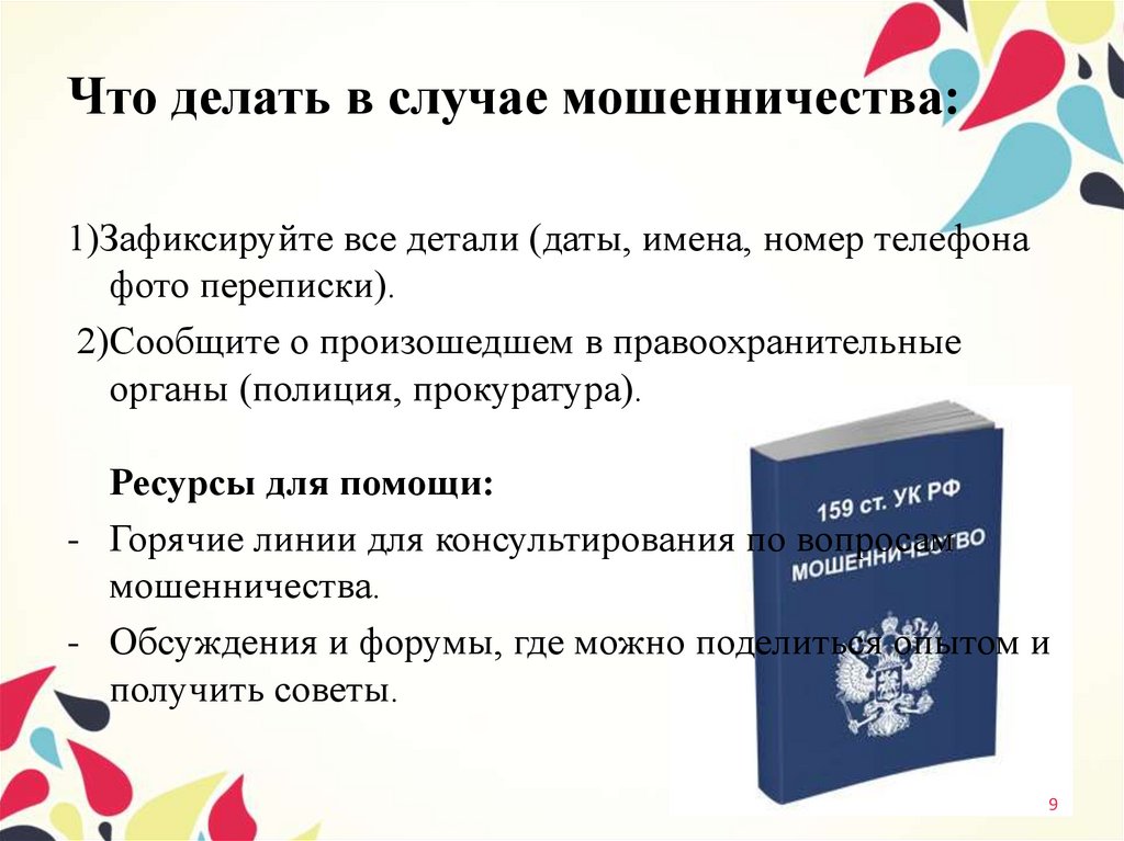 Что делать в случае мошенничества:1)Зафиксируйте все детали (даты, имена, номер телефона