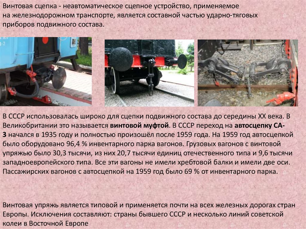 Великобритании это называется винтовой муфтой. В СССР переход на автосцепку СА3 начался в 1935 году и полностью произошёл после 1959 года. На 1959 год автосцепкой