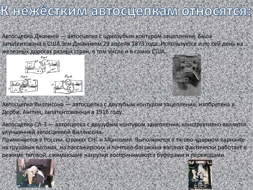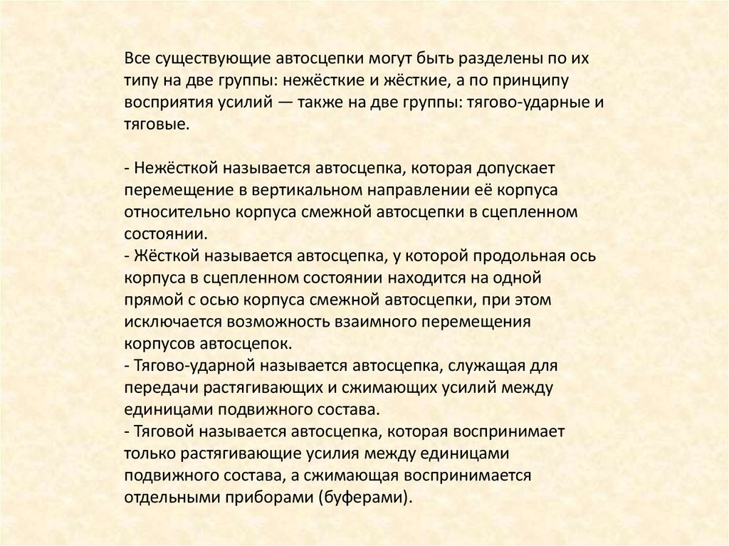 Все существующие автосцепки могут быть разделены по ихтипу на две группы: нежёсткие и жёсткие, а по принципу