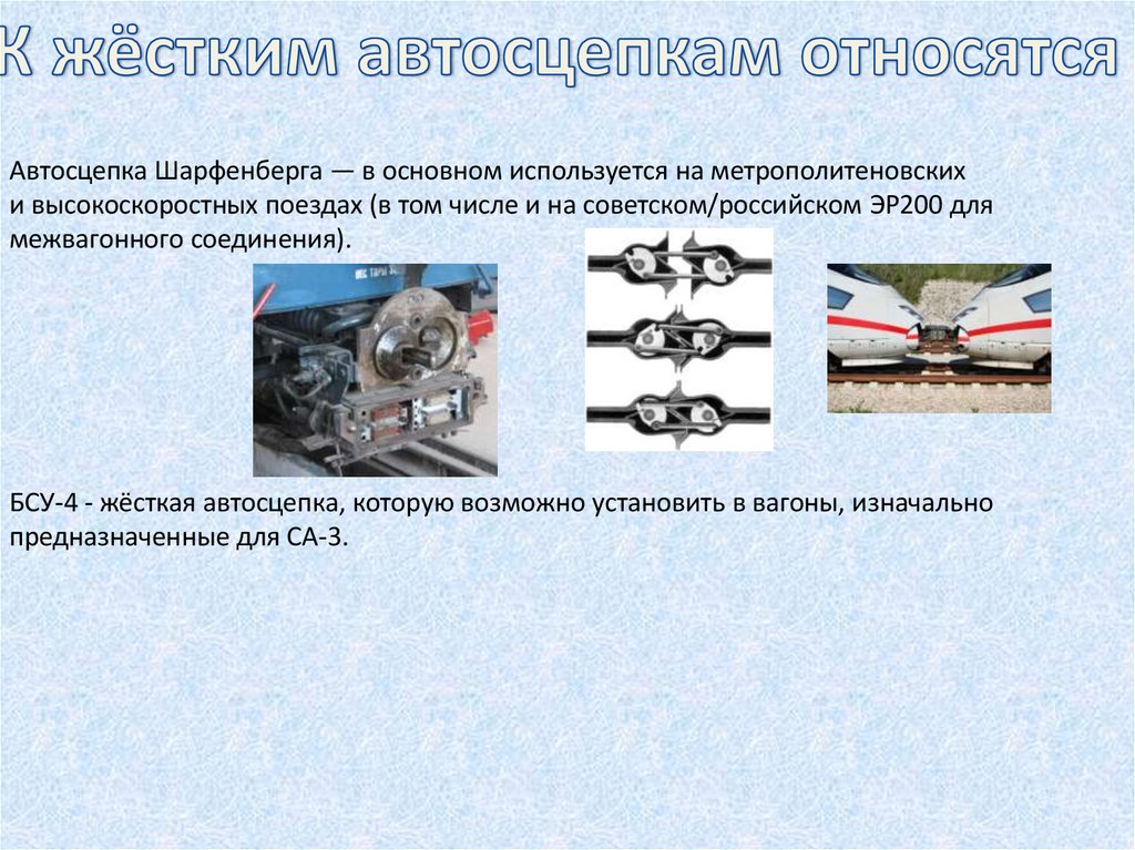 Автосцепка Шарфенберга — в основном используется на метрополитеновскихи высокоскоростных поездах (в том числе и на советском/российском ЭР200 для
