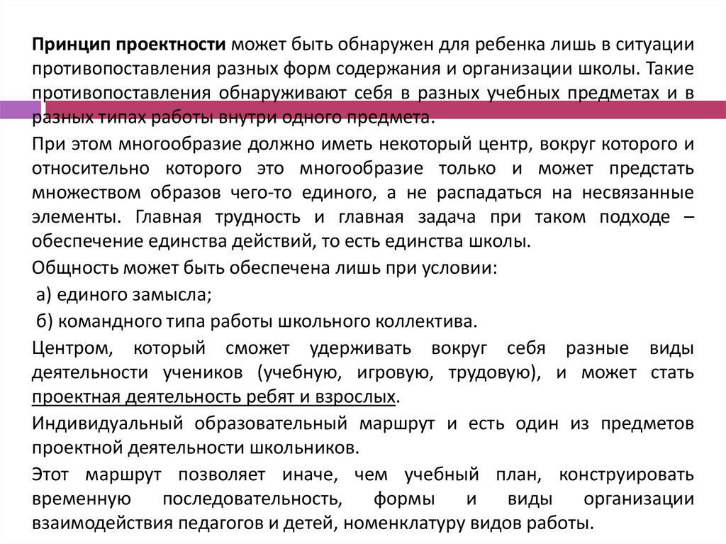 Принцип проектности может быть обнаружен для ребенка лишь в ситуациипротивопоставления разных форм содержания и организации школы. Такие