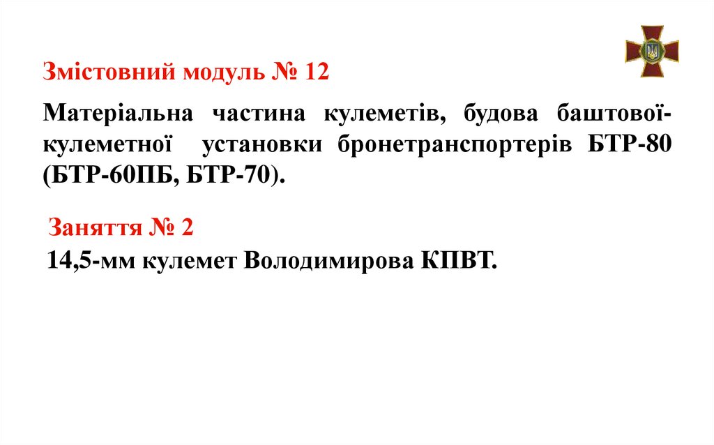 Змістовний модуль № 12Матеріальна частина кулеметів, будова баштовоїкулеметної установки бронетранспортерів БТР-80