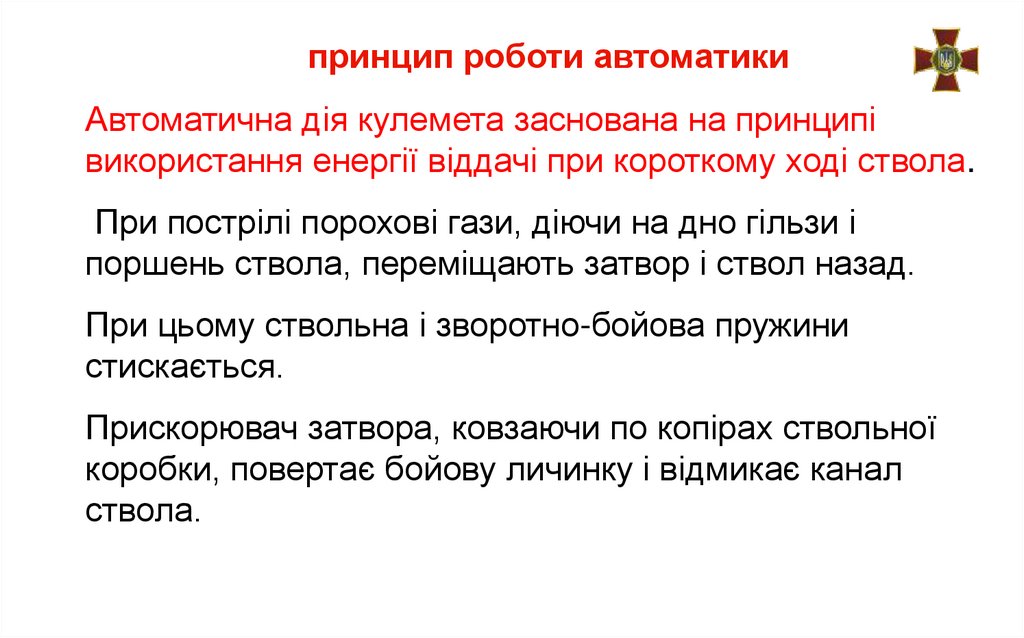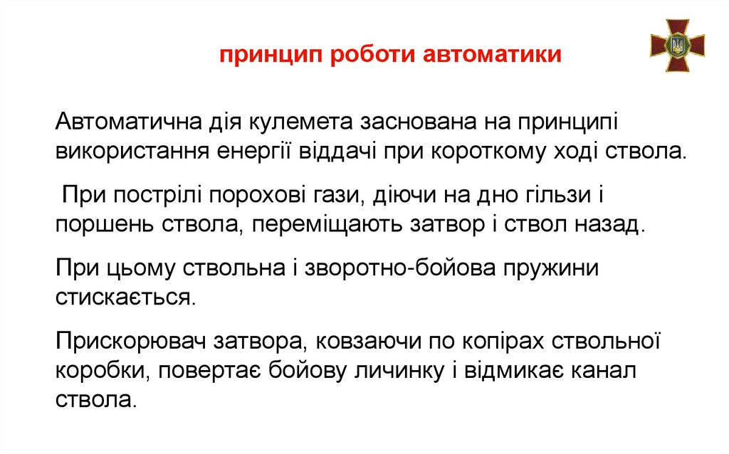принцип роботи автоматикиАвтоматична дія кулемета заснована на принципі