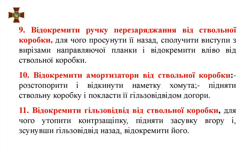 ручки стопорів амортизаторів угору, просунути ствольну коробку вперед і