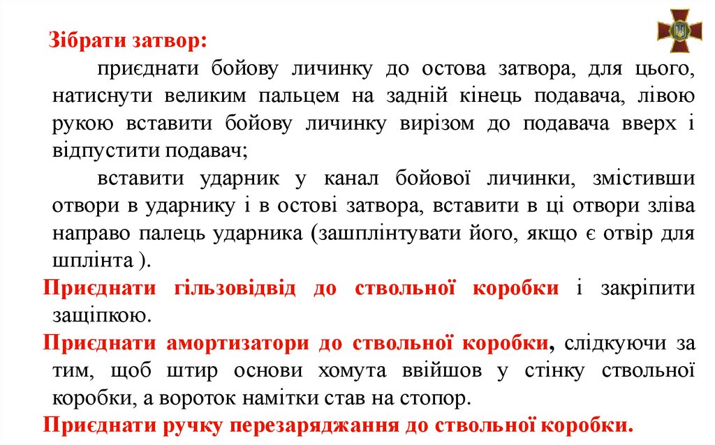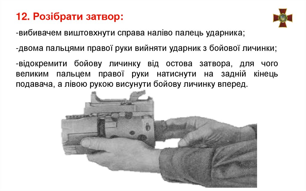 Зібрати затвор:приєднати бойову личинку до остова затвора, для цього,