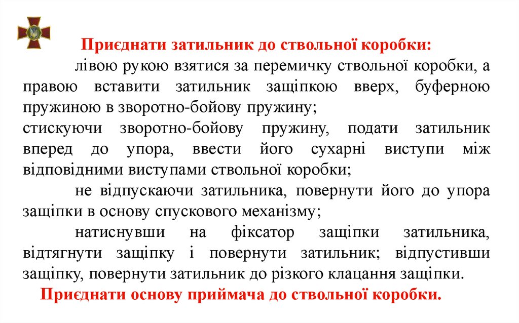 Приєднати затильник до ствольної коробки:лівою рукою взятися за перемичку ствольної коробки, а