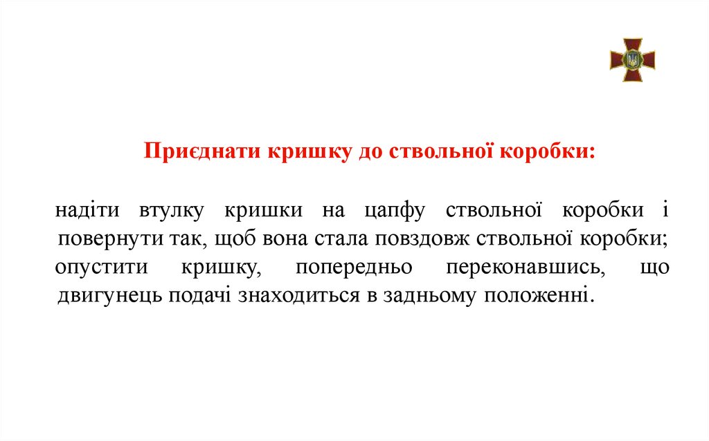 закрити кришку ствольної коробки, повернувши защіпку кришки, при