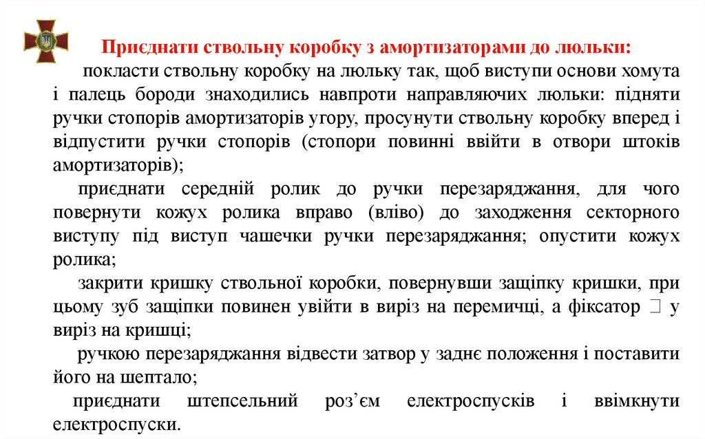 Приєднати ствольну коробку з амортизаторами до люльки:покласти ствольну коробку на люльку так, щоб виступи основи хомута