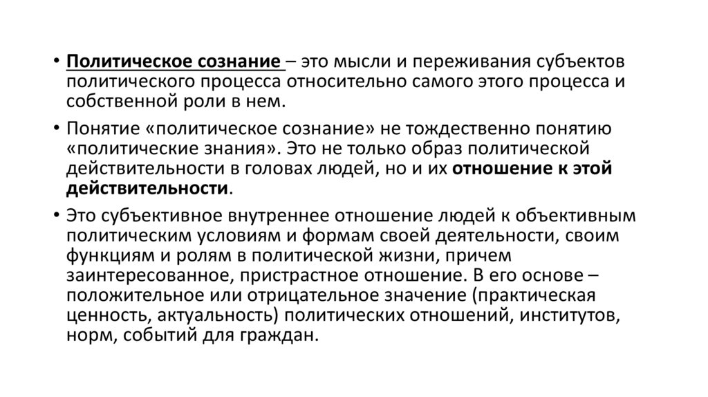 • Политическое сознание – это мысли и переживания субъектовполитического процесса относительно самого этого процесса и