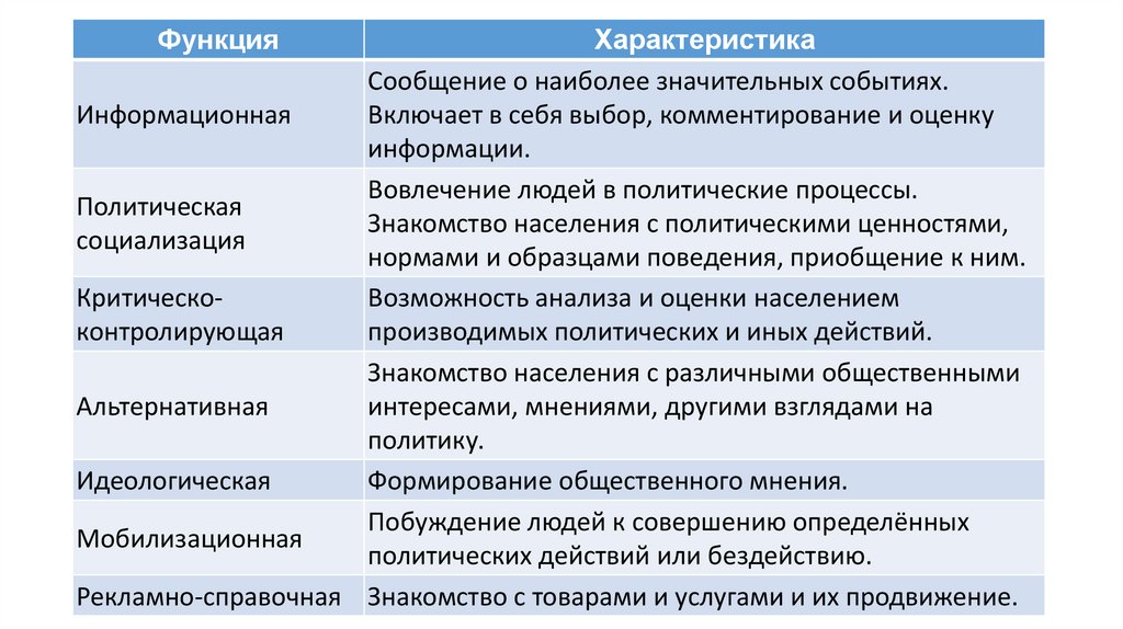 Некоторые их них:• информирование зрителя, читателя, вышестоящие органы;