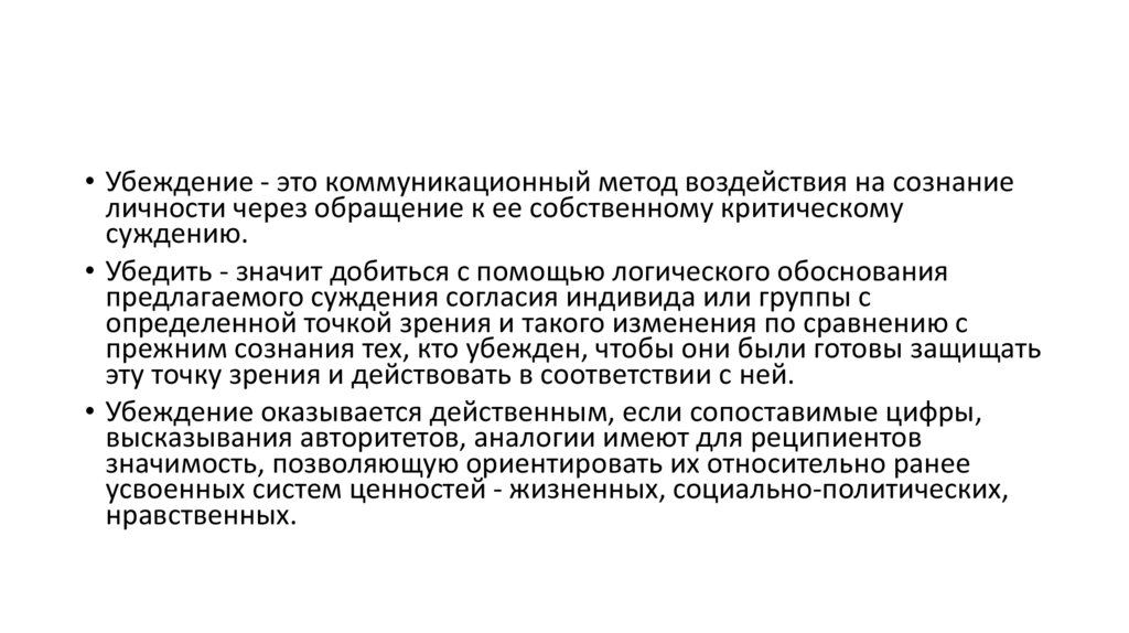 • Убеждение - это коммуникационный метод воздействия на сознаниеличности через обращение к ее собственному критическому